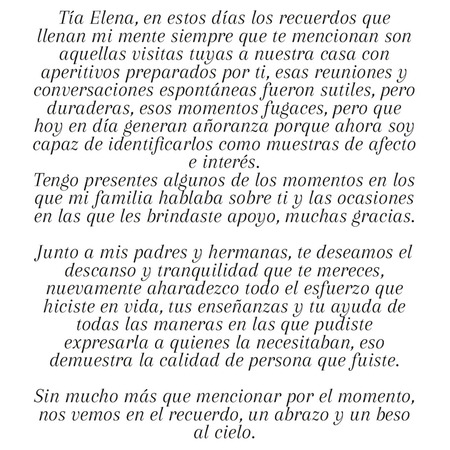 Estimada Tía tu repentina partida no significa un adiós eterno sino un hasta pronto, que nuestro padre eterno te reciba con los brazos abiertos y su luz perpetua te ilumine, descansa en paz
