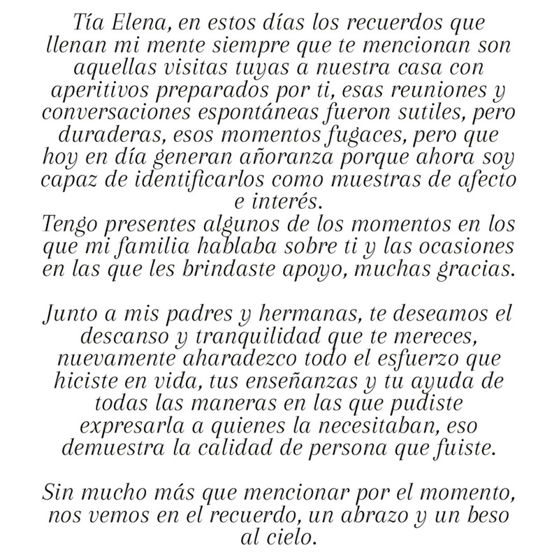 Elenita muchas enseñanzas desde que llegaste a la Familia, muchos recuerdos, gratos momentos e inolvidables experiencias, hoy estás al lado de Javier tomados de la mano felices como siempre. Nunca te olvidaremos Elena.