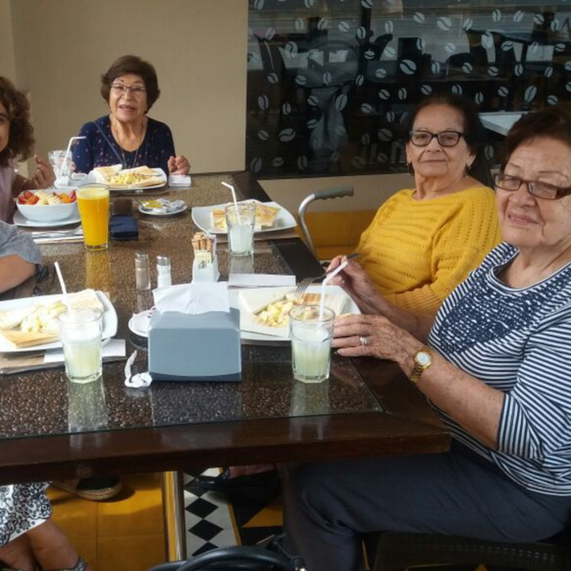 Luisa celebrando un desayuno con su hermana Raquel y con Alicia Miñán.
