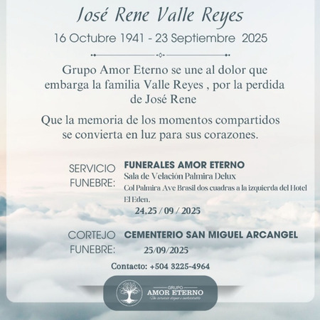 Con profundo pesar, lamentamos la partida de [José René Valle Reyes ], quien en vida fue ejemplo de integridad, dedicación y amor por su familia. Su legado permanece en cada gesto de bondad que dejó a su paso. En estos momentos de dolor,